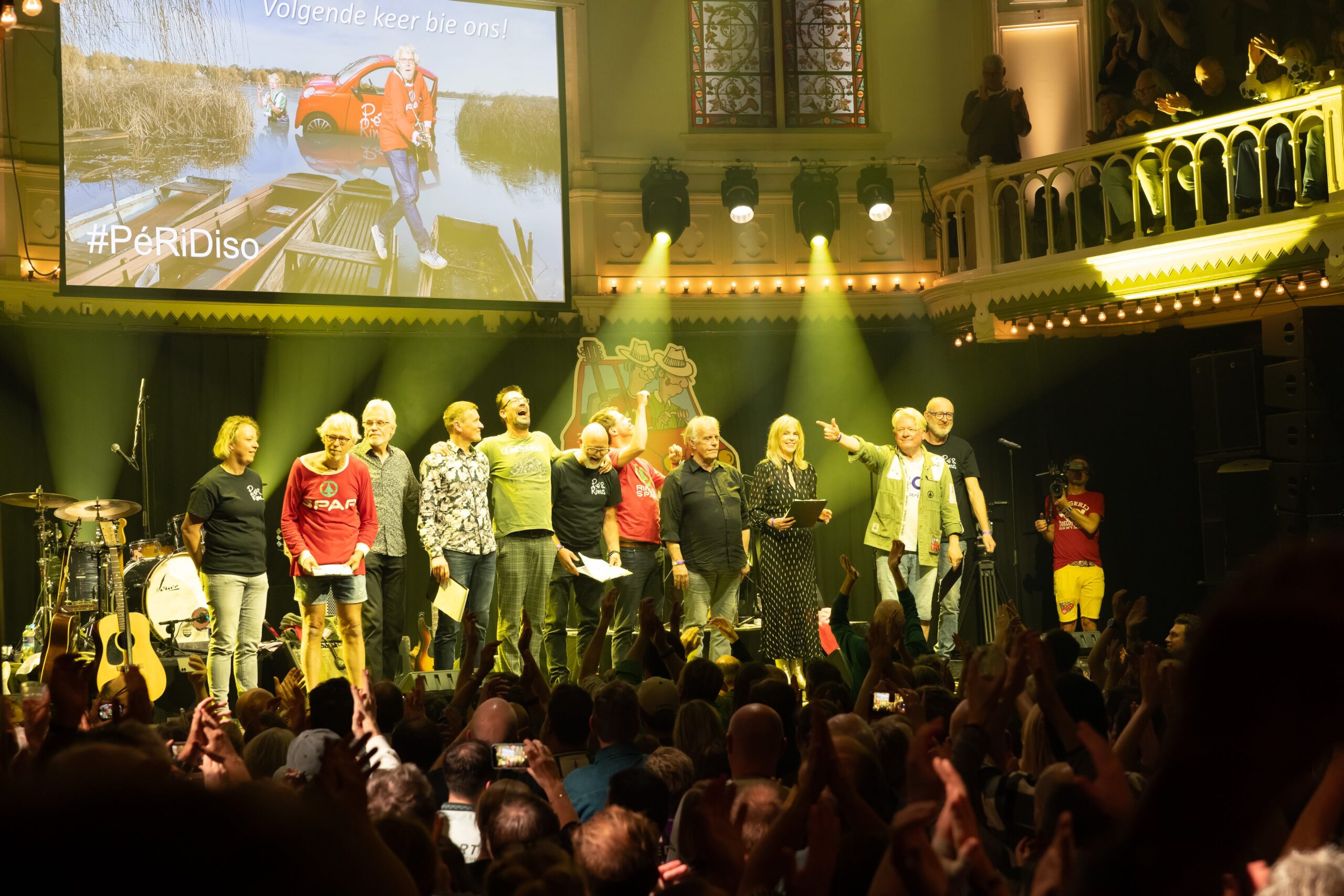 Het werd een historische dag, voor ons dan. De Amsterdamse poptempel was ingenomen door anderhalfduizend woeste Groningse fans, uitgedost met Groningse en SPAR-vlaggen, FC Groningenshirts, zelfgemaakte Sparshirts of shirts met framenummer 1422055 achterop. Het geluid was weer perfect, het licht mooi, de projecties doeltreffend, de band speelde zoals zs nog nooit gespeeld had (of beter gezegd: net zo fantastisch als ze altijd speelt!) en met het hele Team Pé & Rinus zetten we negen kwartier lang Paradiso in vuur en vlam!