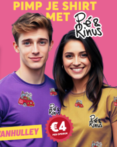 Ook aanwezigop ons Feestje : VanHulley! Hier kun je je eigen merchandise laten produceren. Als je een leuke herinnering wilt hebben aan het Feestje, neem dan vooral een T-shirt of blouse mee, dan zetten wij er het Pé & Rinuslogo op, of de grappige cartoon van Pé & Rinus in de rode Canta! Kosten €4 per logo.