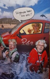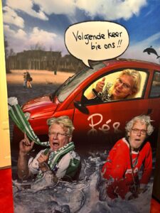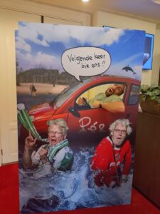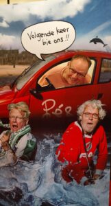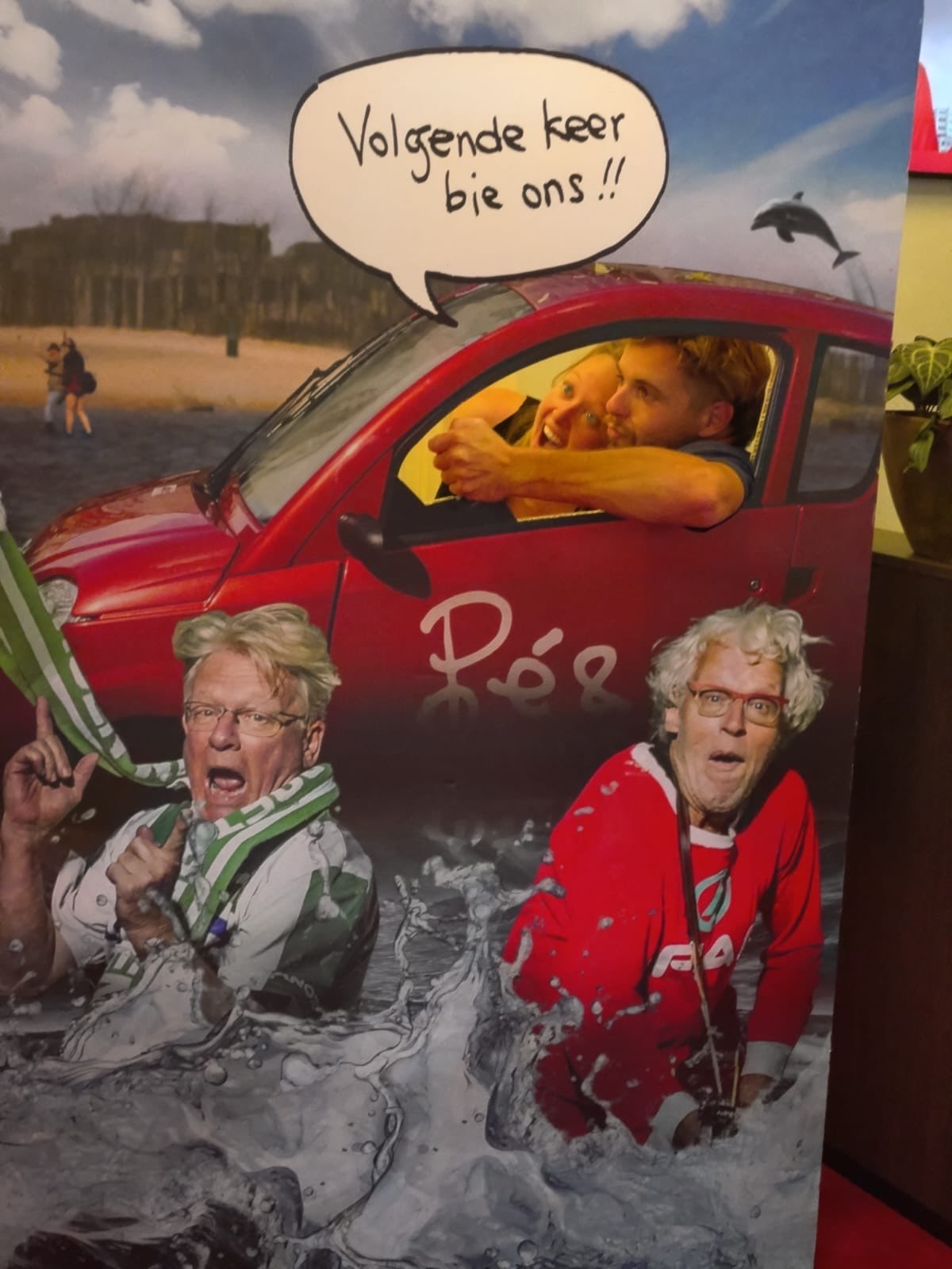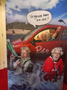 In de foyers van de theaters waar we onze voorstelling Mit 45 deur de bocht spelen, staat een kekke ‘selfiewand’. Daar kunnen onze fans zichzelf fotograferen terwijl ze samen met ons in de Hoornse Plas zitten – zij zelfs pontificaal in onze mooie rode Canta!